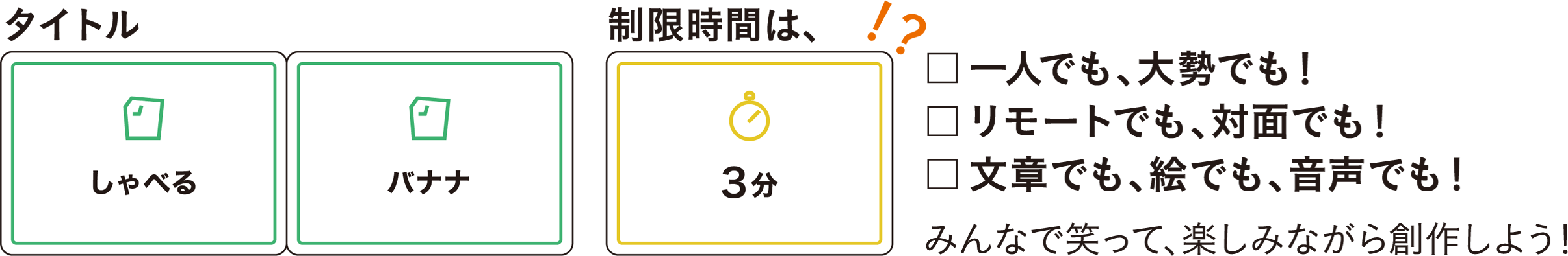 「作文が苦手な方から、創作経験者の方まで。このゲームを通して、一人一人が持つ空想の力を解放し、自由に、楽しみながら、お話づくりに挑戦してみてください!」